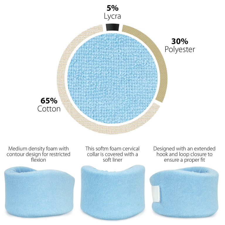 Designed with an extended hook and loop closure to ensure a proper fit. Medium density foam with contour design for restricted flexion. This soft foam cervical collar is covered with a soft liner. This collar, when properly positioned under the jaw.